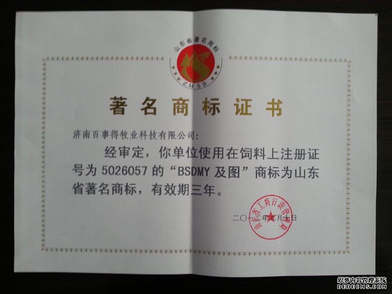 濟南百事得牧業科技有限公司所有的“BSDMY及圖”商標被認定為山東省著名商標,圖片為獎牌及證書。